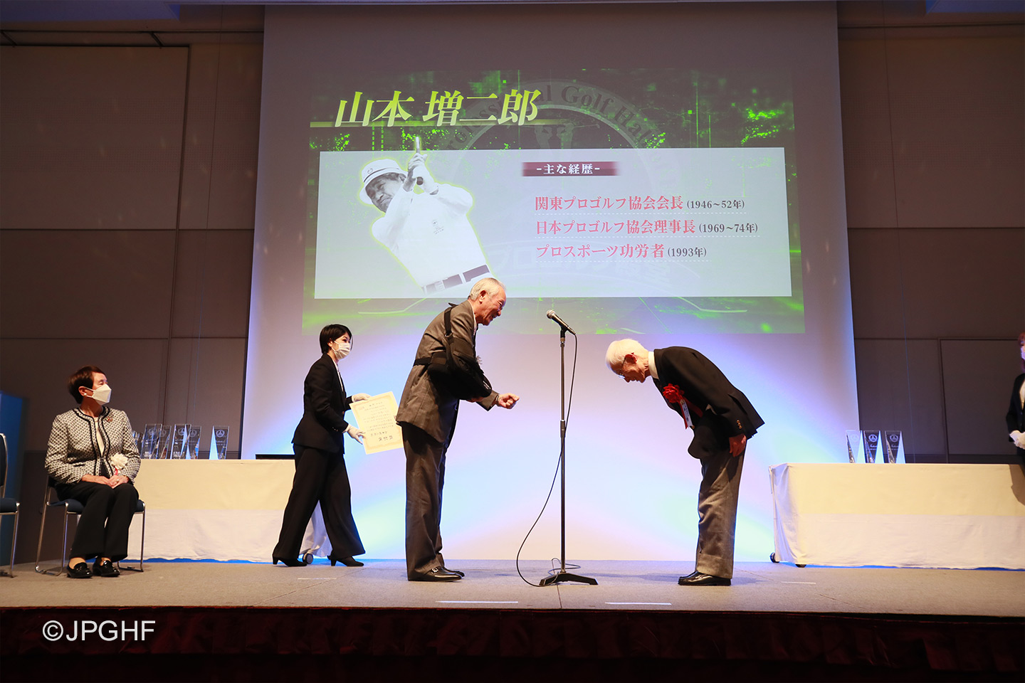 「第八回並びに第九回日本プロゴルフ殿堂入り式典」を3月11日、神奈川・パシフィコ横浜のアネックスホールで行った。主に1972年以前に活躍した選手を顕彰する「レジェンド部門」では、コロナ禍で式典が延期になっていた第8回の中村兼吉、謝敏男、第9回の山本増二郎、古賀春之輔、安田春雄に、主に1973年以降に活躍した選手への「プレーヤー部門」では、第8回の岡田美智子、海老原清治、第9回の尾崎直道、塩谷育代に、それぞれに顕彰状とクリスタルトロフィーを贈った。また、特別賞として、第8回の渋野日向子、第9回の松山英樹、稲見萌寧、笹生優花にそれぞれ表彰状とトロフィーを贈った。(敬称略)