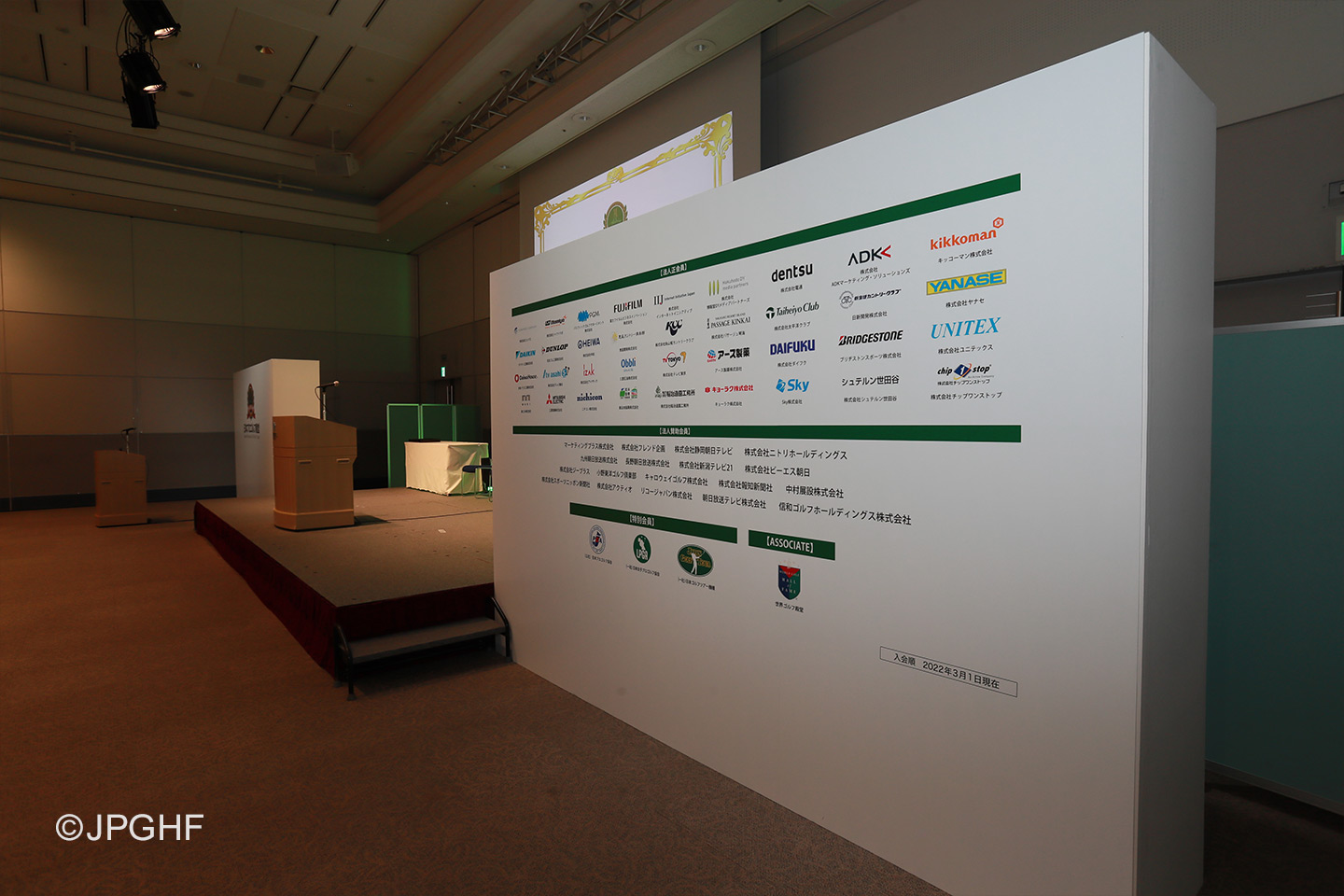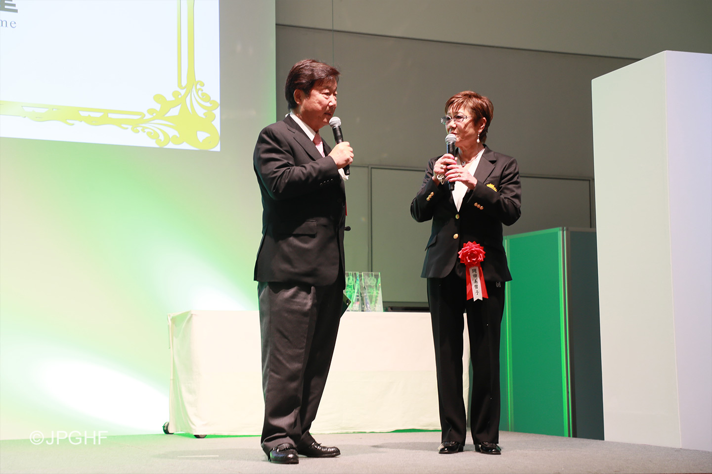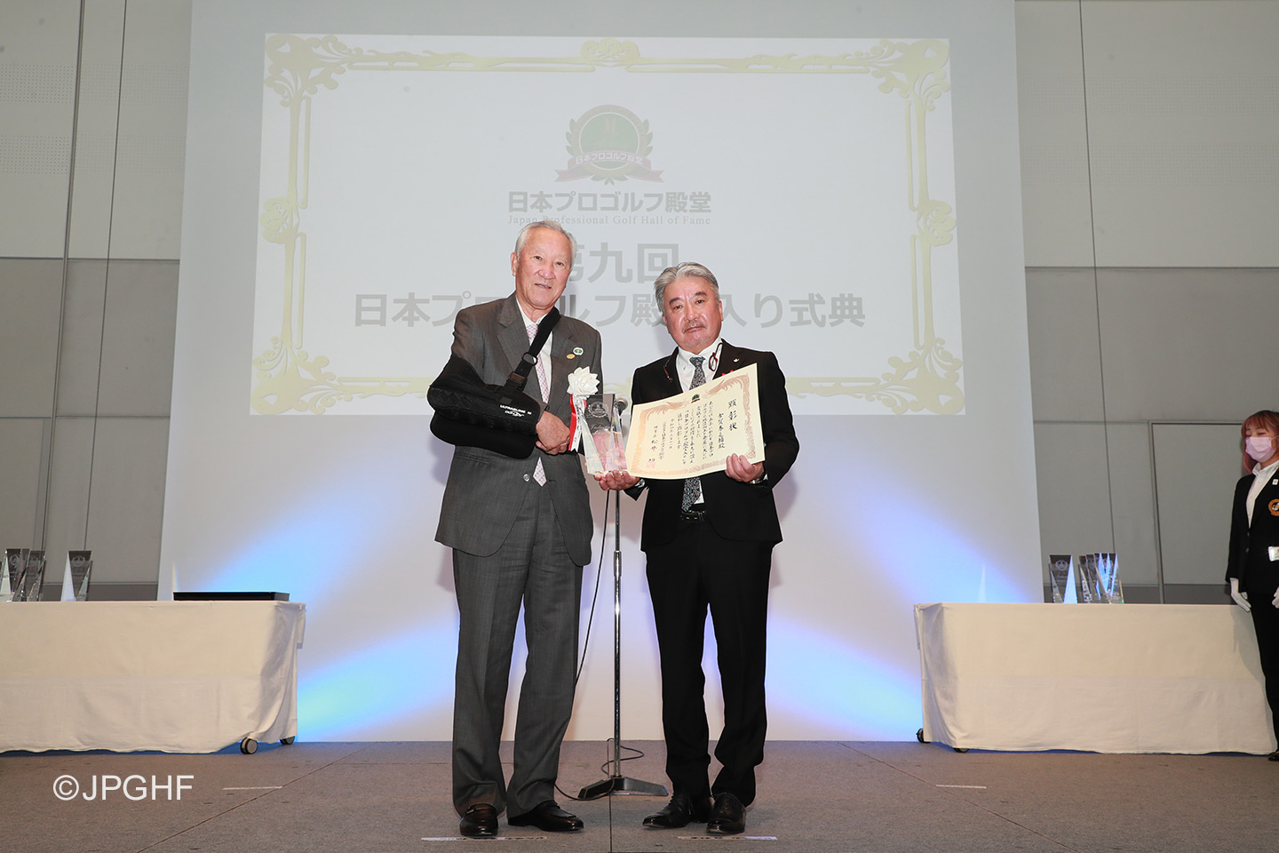 あいさつに立った松井功理事長は、列席した日本プロゴルフ殿堂正会員、賛助会員に感謝し、顕彰者、特別賞表彰者の功績を紹介した。続いて、来賓の日本ゴルフ協会・竹田恆正会長、日本生産性本部の茂木友三郎会長(キッコーマン名誉会長)が顕彰者に祝福の言葉を贈った。第8回顕彰者から壇上に上がった。コロナ禍もあって欠席した謝の顕彰は、前日10日に就任したばかりの吉村金八日本プロゴルフ協会会長が代理で受けた。